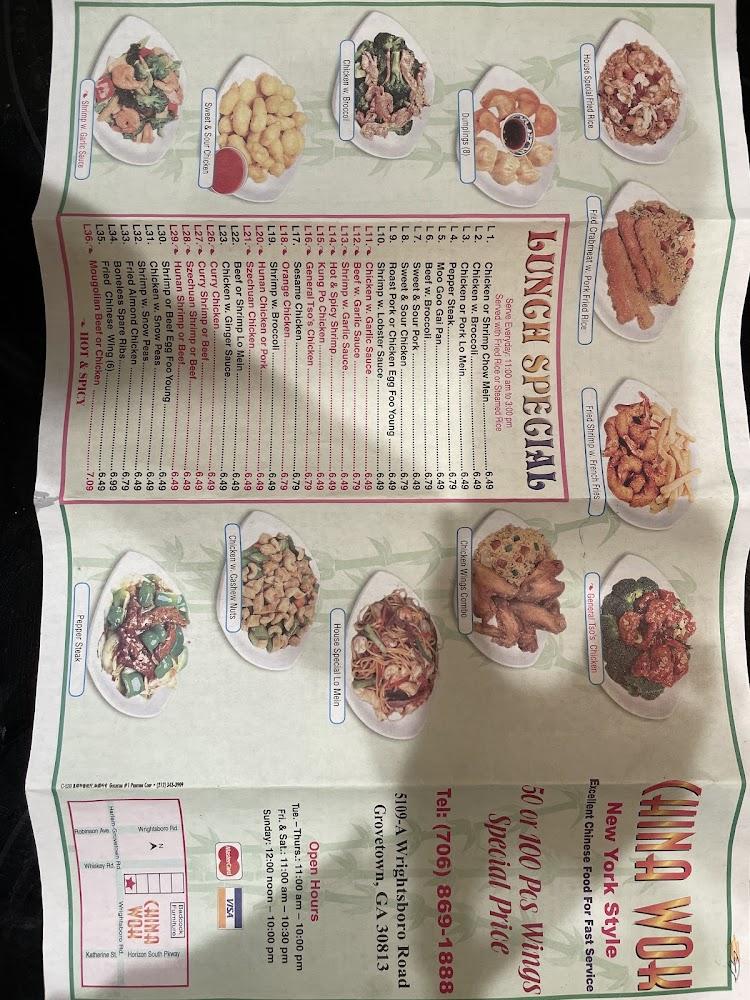 Welcome to China Wok, your go-to destination for authentic Chinese cuisine in Grovetown, GA. Nestled at 5109 Wrightsboro Rd, our restaurant offers a relaxed and inviting atmosphere, perfect for lunch or dinner, whether you're dining solo or with friends. Please note that our menu showcased online may not be accurate, and we do not offer online orders or delivery. For any inquiries, feel free to ask our friendly staff. Enjoy a variety of tasty dishes, including our popular chicken wings and lo mein, with vegetarian options available. Visit us for a delightful dining experience today!